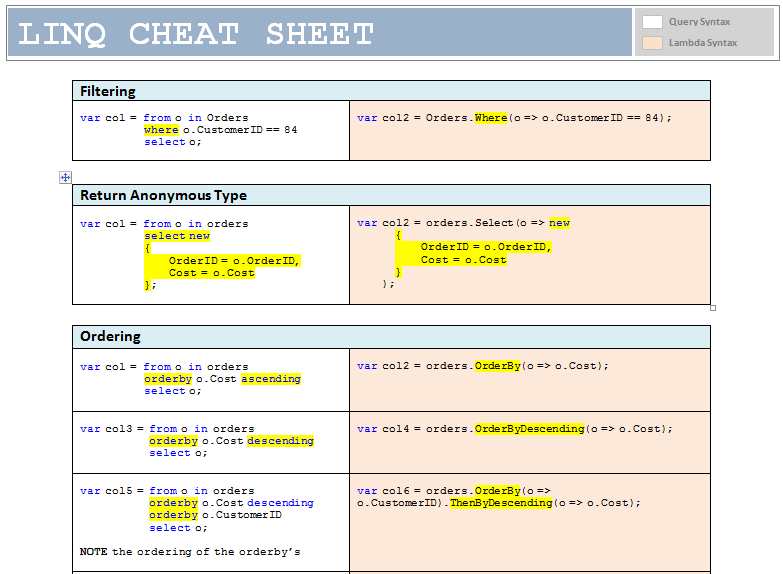 A while ago when I was learning LINQ I searched the web for a 'cheat sheet'. I needed a single document that covered most of the common scenarios w.r.t LINQ so that I would not need to google every time I was writing LINQ queries. I found one very good one : http://aspnetresources.com/blog/linq_sqo__cheat_sheet.aspx . But I wanted more (as usual) so I created my own. I was also new to lambda expressions and I wanted to learn the differences between syntax in a LINQ query written in 'query syntax' and 'lambda syntax' so I also included that as part of my cheat sheet. Every query is given in both syntaxes. Here is a screenshot:
