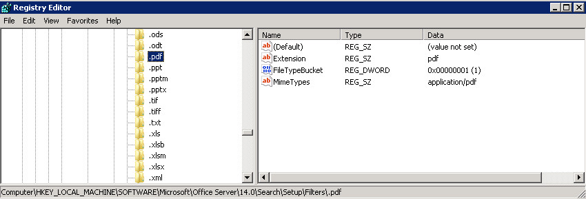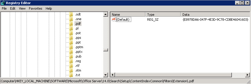 - Run RegEdit and modify Extension (HKEY_LOCAL_MACHINE\SOFTWARE\Microsoft\Office Server\14.0\Search\Setup\ContentIndexCommon\Filters\Extension)