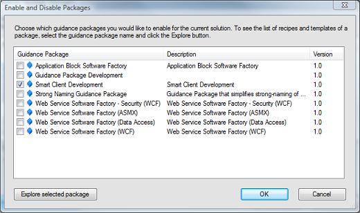 In order to enable back the Software Factory in your specific solution use the Guidance Package Manger which is located under the Visual Studio Tools menu, when you open the guidance manager click the Enable/Disable Packages and choose the desired guidance package (i.e. Smart Client Developments in our case)