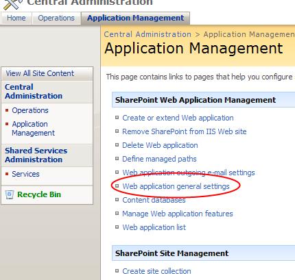 Now, in the SharePoint Web Application Management section, click on Web application general settings.