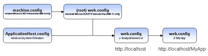 ASP.NET application root directory | Web.config | The Web.config file for a specific ASP.NET application is located in the root directory of the application and contains settings that apply to the Web application and inherit downward through all of the subdirectories in its branch. |