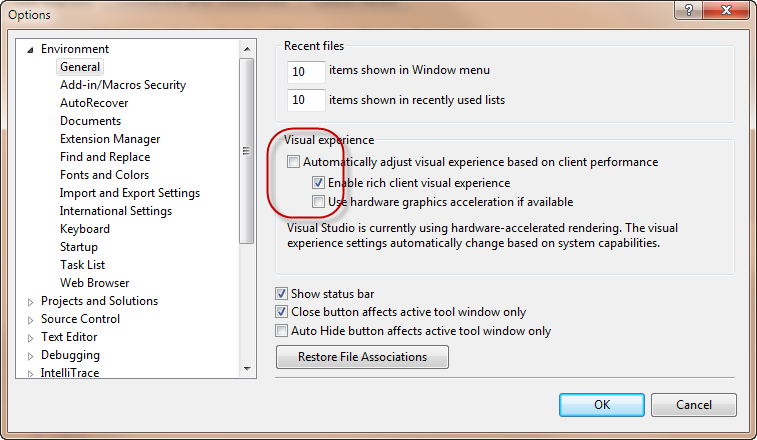 Hardware acceleration for Visual Studio is disabled on Windows XP