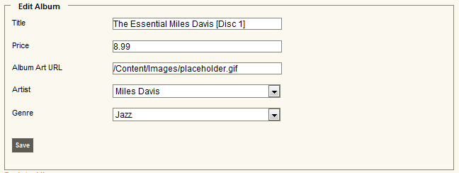 Our StoreManagerController.Create() action can then return a ViewModel which holds an empty Album object, along with lists of Artists and Genres to be populated: