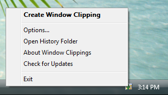 The Window Clippings main context menu can be displayed by right clicking the icon in the notification area.