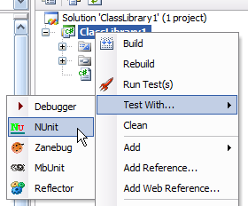 You may be wondering where the 'Test With... NUnit GUI' option has disappeared to in recent builds. I have been working on opening this up so that other test framework providers can include their GUI test runner as an option. In the current build this menu will be auto populated when TestDriven.NET is activated in the Visual Studio process. This means you won't see these options until TestDriven.NET has been activated on demand (you have used one of TD.NET's other buttons) or 'Startup' is checked in the 'Add-in Manager'. The easiest way to 'fix' this would be to install with the activate on start-up option on by default. I'm reluctant to do this however because I don't want to slow Visual Studio's start-up by even a fraction of a second!