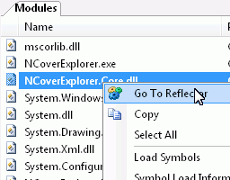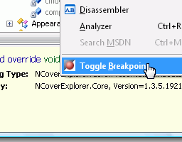 Below are a few frames from a screencast that shows how to debug an application using the new 'Go To Reflector' functionality in TestDriven.NET 2.0. I'm using Grant Drake's NCoverExplorer as a target for the debugger. Once attached I use Reflector to view one of the loaded modules. I then set a breakpoint on the AboutDialog's OnLoad method.
