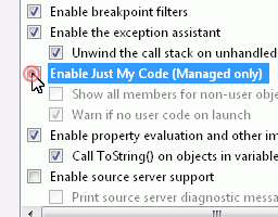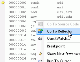 The first time I open the dialog the Visual Studio 2005 debugger option Just My Code is enabled (the default). I am showing this because you will probably forget to disable this feature at least once and wonder why breakpoints are not being hit. You can find this setting under 'Options\Debugging'. Once I uncheck this setting the breakpoint is hit and I'm able to step through the x86 code. You can see me using 'Go To Reflector' on the 'Dissasembly' and 'Call Stack' windows.