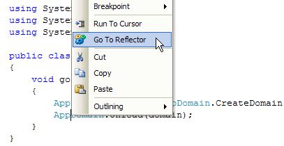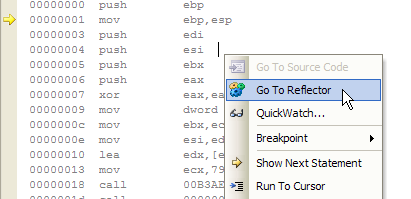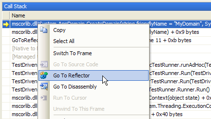 A few weeks ago I wrote a post about some Reflector integration that is now part of TestDriven.NET. I have now greatly expanded that integration. When you install the latest version you will find 'Go To Reflector' buttons on Visual Studio's 'Disassembly', 'Call Stack' and 'Code' context menus. This is intended to compliment the standard 'Go To Disassembly' and 'Go To Source' buttons.