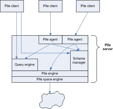 A Pile client then can use the query engine and a schema manager to access associations. Query engine and schema manager are generalized Pile agents. Since traversing the mesh of relations in a Pile requires many small steps through the Pile space, all operations need to run close to the Pile, i.e. in a server process (or embedded in a client process). Only results should be send back to clients.