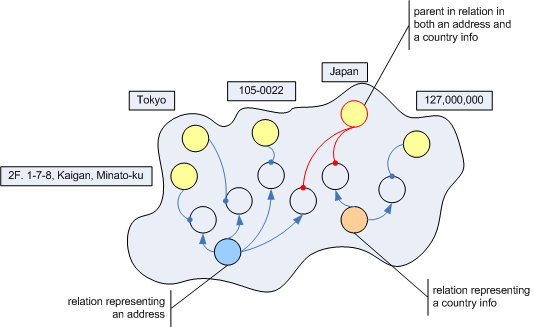 This sounds a bit like in relational databases, but please mind the differences: 1. Each value for an attribute would need to be stored only once. 2. No indices are needed to speed up linking of addresses and country infos, since if you have the handle to a country name, you immediately have the handles into all the addresses and country info "entities" (via the associative tree in Pile, see the red lines above). 3. There is no limit as to how fine grained you choose your Terminal values. 4. There is no fixed physical boundary around "groups" of Terminal values or groups of such groups etc. like rows or tables which would limit your ability to connect.