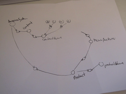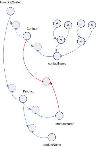 The Contact that´s connected to the Manufacturer in the above picture in fact does not exist separately, since it´s the same as the Contact hanging directly beneath the InvoicingSystem relation. So the above picture is wrong, in reality the Pile looks like this: