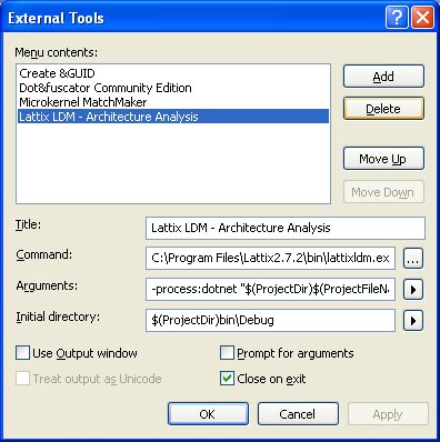 Fig. 2: Setup for Lattix LDM as an External Tool in VS2005