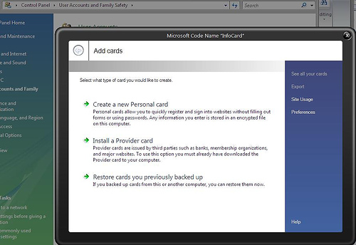 Note: In Build 5384 of Vista you need to go to Control Panel, User Accounts (and Family Safety), and choose “Digital Identities”. It will launch the InfoCard interface.