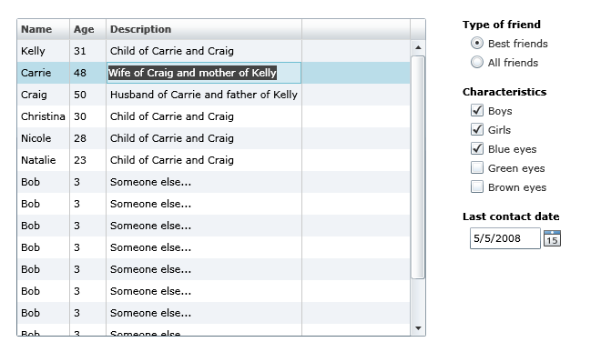 Today's RC build has skins that are close to the final look we plan to ship (there are a few final tweaks we are doing post RC on the focus color of controls, as well as to tighten up and tweak a few issues in some of the control templates). Below is the default look for the DataGrid, RadioButton, CheckBoxes, and the DatePicker controls with today's RC build: