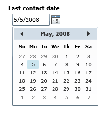 Note that the DatePicker control above allows users to type in a date (with a masked edit to ensure it is a valid date), or they can click the calendar icon to the right of the textbox and select the date using a popup Calendar control: