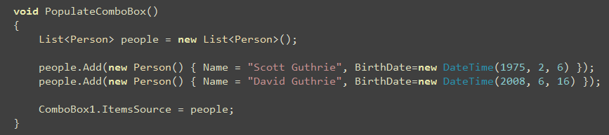 And then write the below code to databind a collection of Person objects to the ComboBox (by setting its ItemSource property):