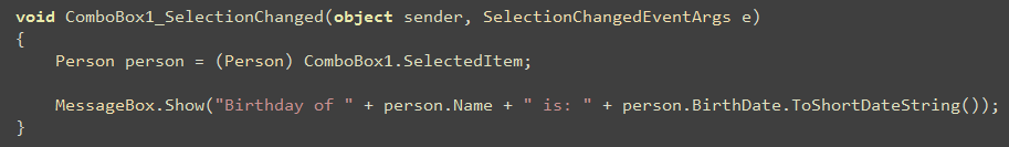 We could then implement a SelectionChanged event handler like below to run code when a person is selected from the ComboBox: