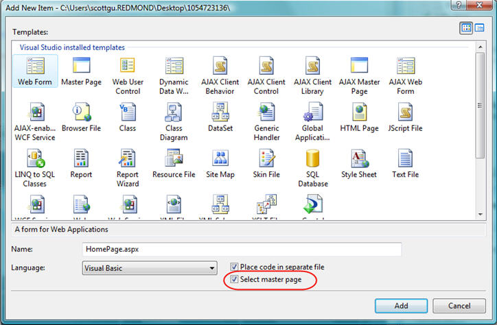 Let's create a new page that we'll call "HomePage.aspx" - and indicate that we want it to be based on a master page: